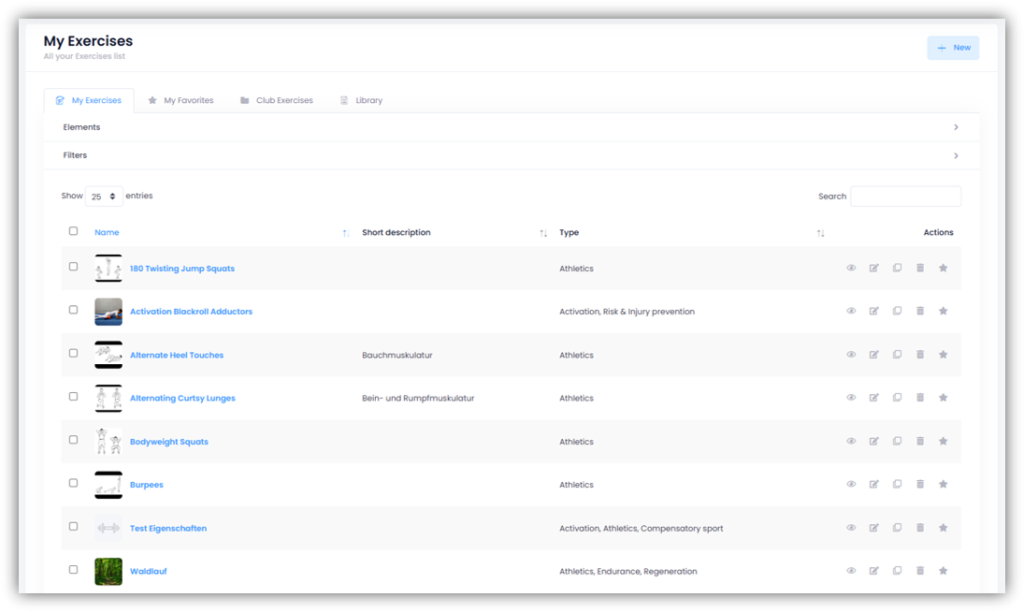 Under “My Favorites” you can see all the exercises that you have marked with a star either under “My Exercises“, “Club Exercices” or in the “Library” (click on the “star symbol” under “Actions” on the right of the corresponding exercise). This way you have all your favorite exercises together.