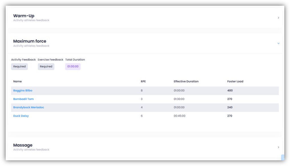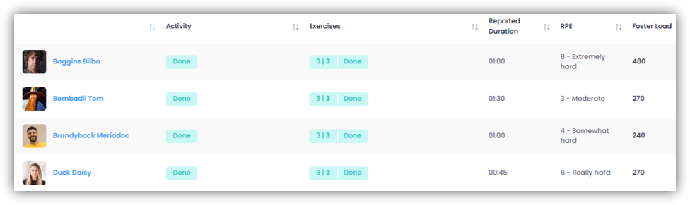In the scheduled activity, go to the “Feedback” tab. Here you have a list of your athletes. You can see for all athletes their reported duration, RPE value and Foster Load. If you click on “Done” in the “Activity” column, you can also view the athletes’ comments on the activity.