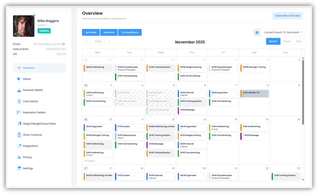 Here you have an overview of all your appointments that have been scheduled for you. If you click on an appointment, you will be taken directly to that event and see all the details that your coach has entered for it. At the top, you can also use the “Activities”, “Sessions”, and “Competitions” buttons to display only certain appointments.