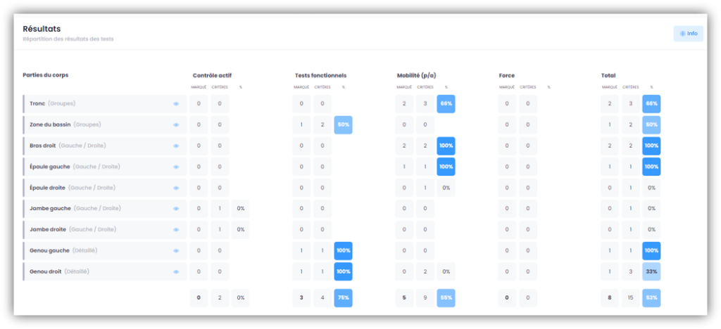 D’autre part, les résultats des tests sont répartis en fonction des différentes parties du corps et des fonctions corporelles. Pour chaque partie du corps, tu peux voir combien de critères ont été testés et combien d’entre eux ont été marqués lors du remplissage du test. Plus le nombre de tests marqués est élevé, plus le pourcentage affiché est important.