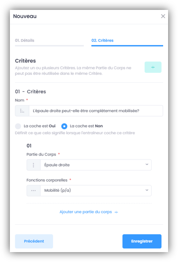 Ajoute maintenant les différents critères qui seront contrôlés dans le cadre de ce test. Saisis à chaque fois le nom du critère et de quelle «Partie du Corps» il s’agit pour ce critère. En outre, tu dois indiquer la «Fonction corporelles» qui doit être testée. Tu peux également sélectionner plusieurs «Fonctions corporelles».