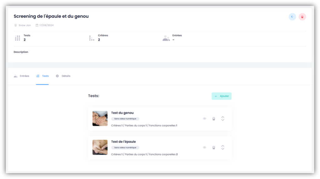 Sous SCREENING DES ATHLÈTES – TESTS, tu peux créer autant de tests que tu le souhaites.