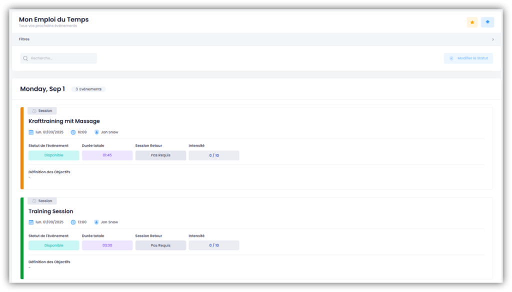 Tu peux voir ici tous tes événements pour les prochains jours. Clique sur le nom d’un événement pour voir plus de détails.
