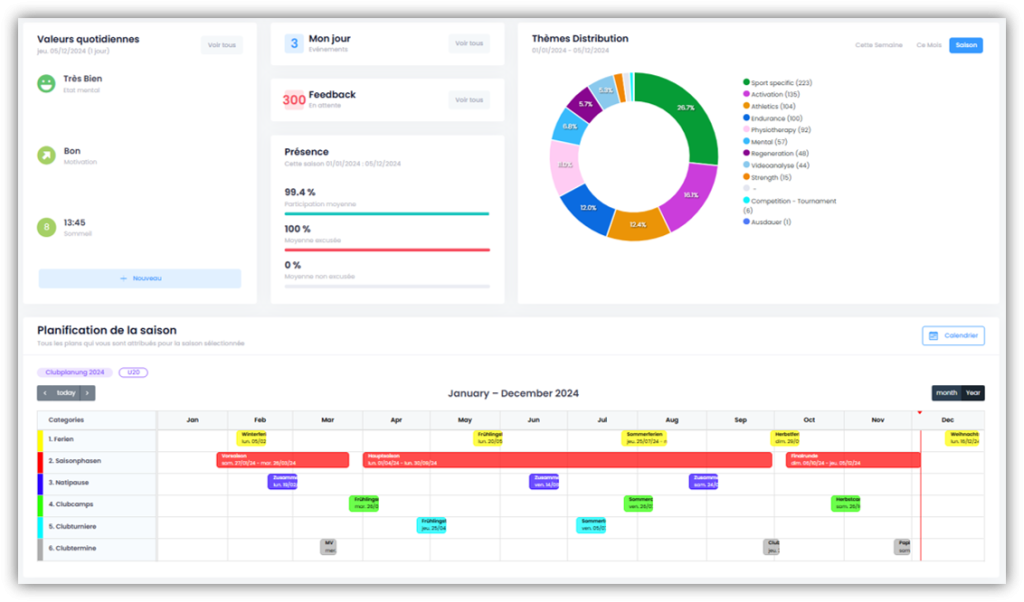 Sous DASHBOARD, tu trouveras d’une part un aperçu avec différents chiffres clés concernant tes activités d’entraînement, y compris la représentation de la planification de la saison. De plus, mon planning et un calendrier sont à ta disposition.