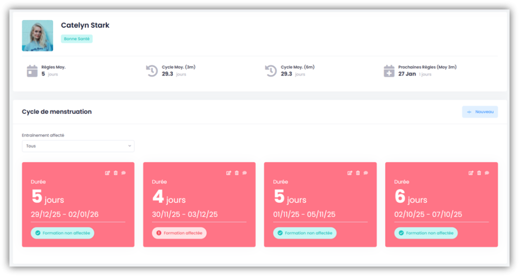Clique sur «+ Nouveau» à droite sous SANTÉ – CYCLE MENSTRUEL. Dans la fenêtre qui s’affiche, indique la date de tes dernières règles. Tu peux également indiquer si tes règles ont eu une influence sur ton entraînement. Si nécessaire, tu as également la possibilité d’ajouter un commentaire.