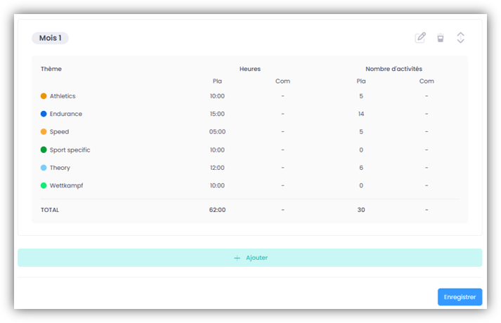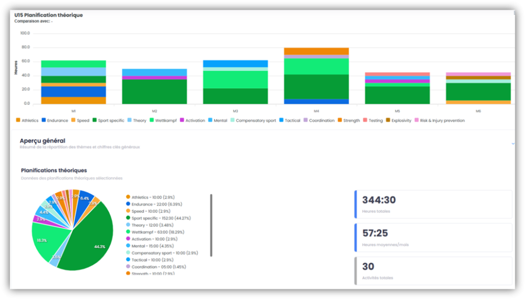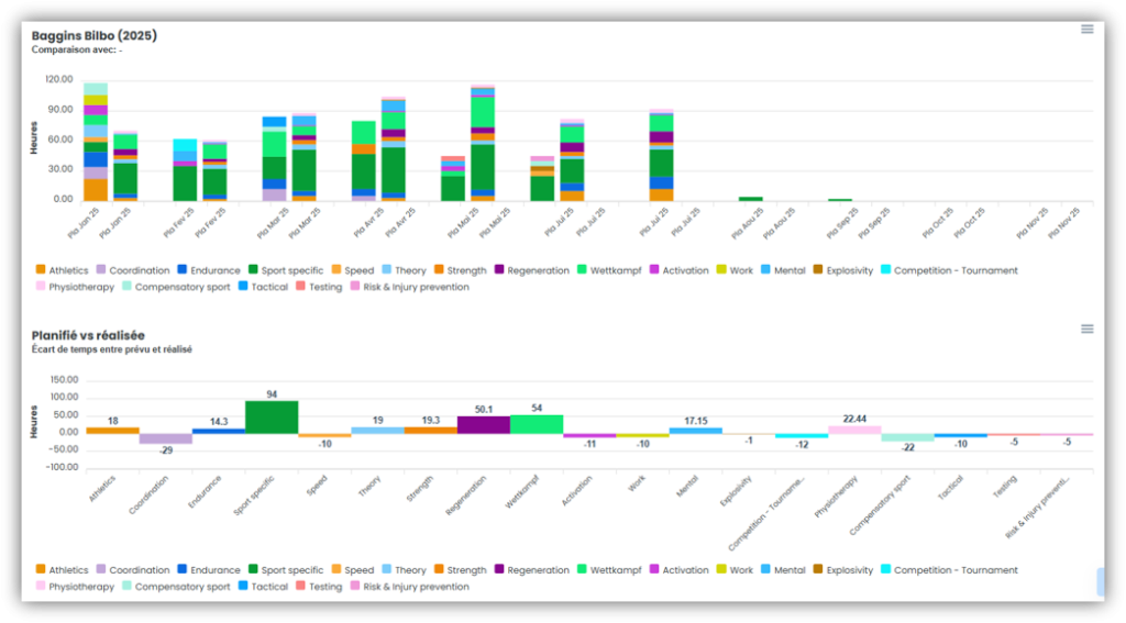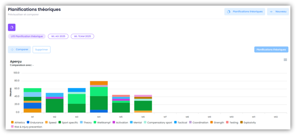 Créez vos propres planifications théoriques sous SAISON – PLANIFICATION THÉORIQUE ET RÉALISÉE, dans lesquelles vous définissez le nombre d’heures que vous souhaitez consacrer chaque mois à un thème particulier. Attribue ensuite les planifications théoriques à tes athlètes et compare-les avec les unités d’entraînement effectivement réalisées.