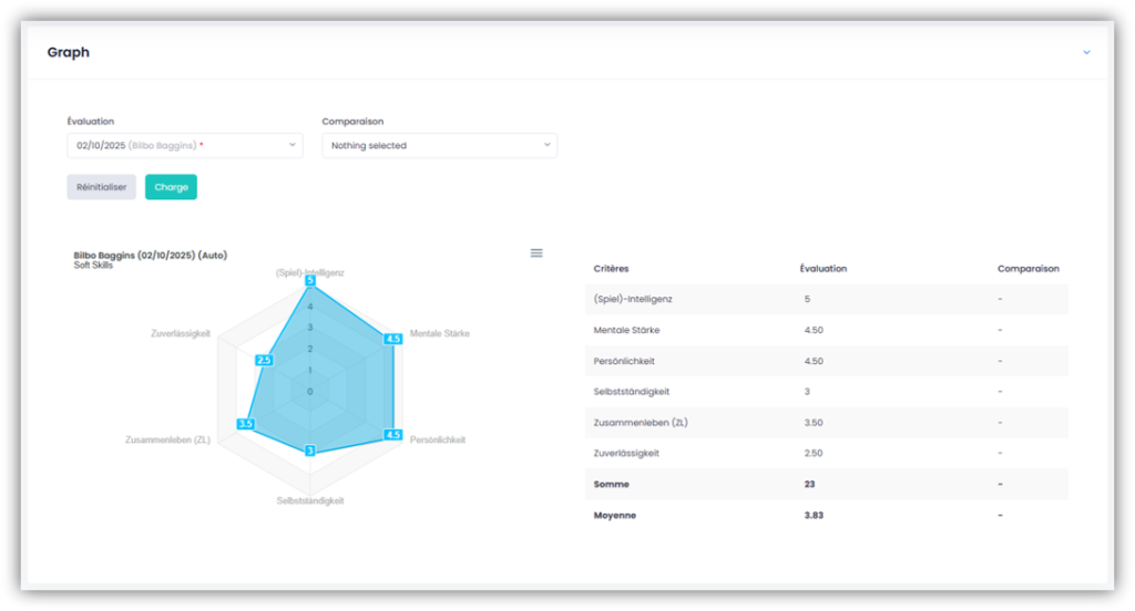 Dans la partie supérieure, tu peux comparer graphiquement deux résultats. Pour ce faire, sélectionne une évaluation sous «Évaluation» et une deuxième sous «Comparaison» que tu souhaites comparer.