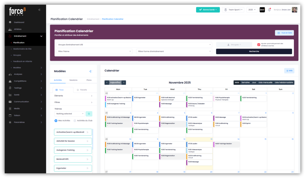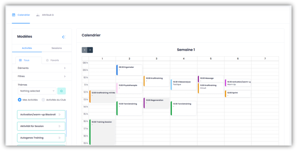 Créer ton propre plan d’entraînement sous ENTRAÎNEMENT – MODÈLES – PLANS D’ENTRAÎNEMENT. Dans ces plans, tu peux définir les activités et les sessions prévues pour chaque semaine. Les plans d’entraînement peuvent ensuite être facilement attribués à des athlètes individuels ou à des groupes d’entraînement dans la planification.