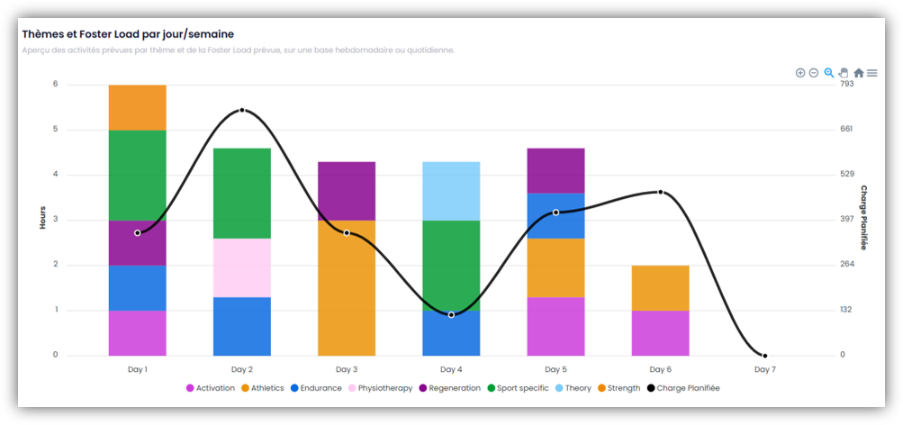 Tu obtiens en outre un aperçu graphique de la Foster Load planifiée (à condition que tu aies saisi une valeur RPE correspondante pour les activités). Si tu affiches une seule semaine de ton plan d’entraînement, la Foster Load est indiquée pour chaque jour. Si tu affiches l’ensemble du plan d’entraînement, la Foster Load est indiquée pour chaque semaine.