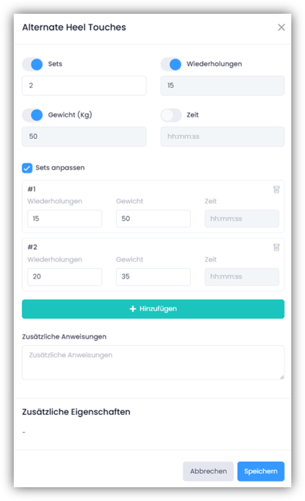 Klicke rechts bei einer Übung auf das «Zahnrad Symbol». Im daraufhin geöffneten Fenster werden Dir oben die vier vordefinierten Eigenschaften Sets, Wiederholungen, Gewicht und Zeit angezeigt. Schiebe die Regler der Eigenschaften, die Du verwenden möchtest, zur Seite und gib die entsprechenden Werte ein.