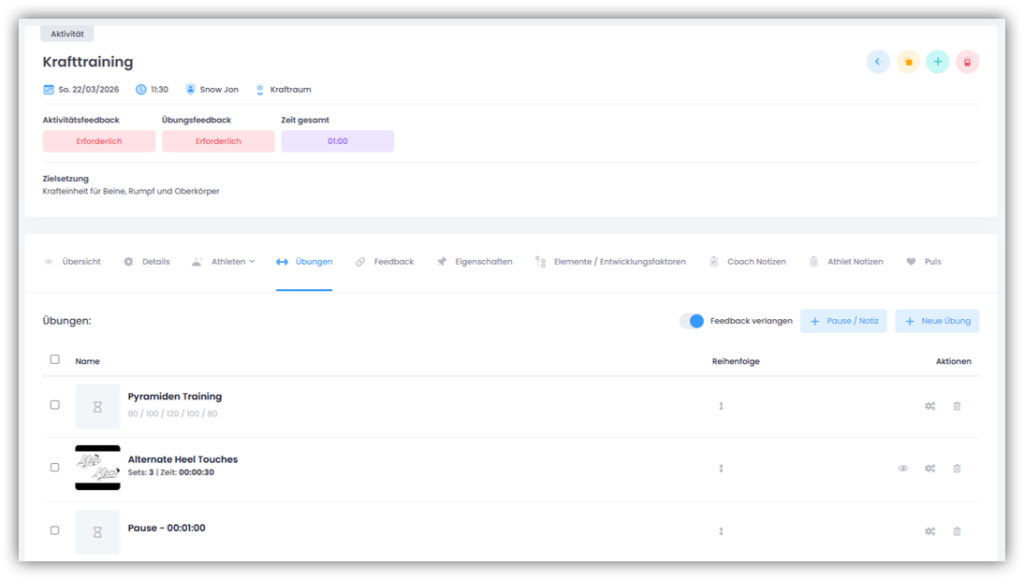 - Im Reiter «Übungen» kannst Du einer Aktivität Übungen hinzufügen (mehr dazu weiter unten).