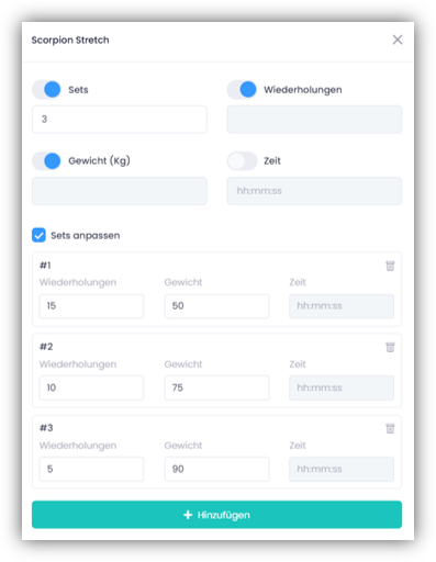 Im daraufhin geöffneten Fenster werden Dir oben die vier vordefinierten Eigenschaften Sets, Wiederholungen, Gewicht und Zeit angezeigt. Schiebe die Regler der Eigenschaften, die Du verwenden möchtest, zur Seite und gib die entsprechenden Werte ein.
