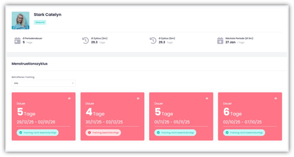 Klickst Du auf den Namen einer Athletin, erhältst Du eine detaillierte Übersicht ihrer Einträge. Du siehst, ob und wann die Periode das Training beeinträchtigt hat, und kannst allfällige Kommentare einsehen. Zusätzlich werden Dir die durchschnittliche Dauer der Periode, der durchschnittliche Zyklus über 3 und 6 Monate sowie ein voraussichtlicher Zeitpunkt für die nächste Periode angezeigt.
