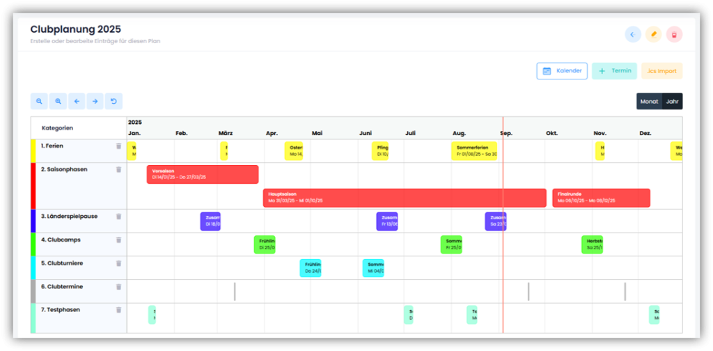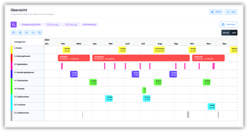 Zunächst musst Du eine oder mehrere Kategorien erstellen. Klicke dazu rechts auf «Pläne» und anschliessend auf «Kategorien». Im erscheinenden Fenster kannst Du einen Namen für die Kategorie eingeben (z.B. Saisonphasen, Clubtermine, Ferien usw.) und eine Farbe auswählen, die die Kategorie repräsentiert.
